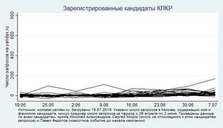 9 июля Овчинников опубликовал данные по оппозиционным самовыдвиженцам в сравнении с несколькими кандидатами РОДП «Яблоко» (см. рис. 3.2)[17]. У большинства известных и ярких кандидатов число запросов превышало 1000.